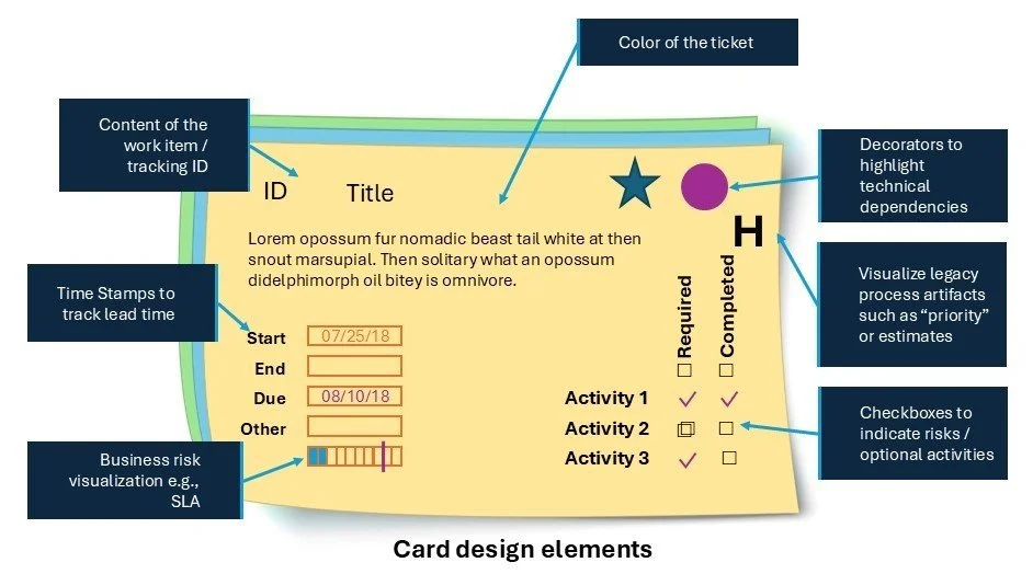 Effective card design (see image below) is key to a successful Kanban system. A well-designed card should display relevant information to aid decision-making. Some elements to consider for card design include: